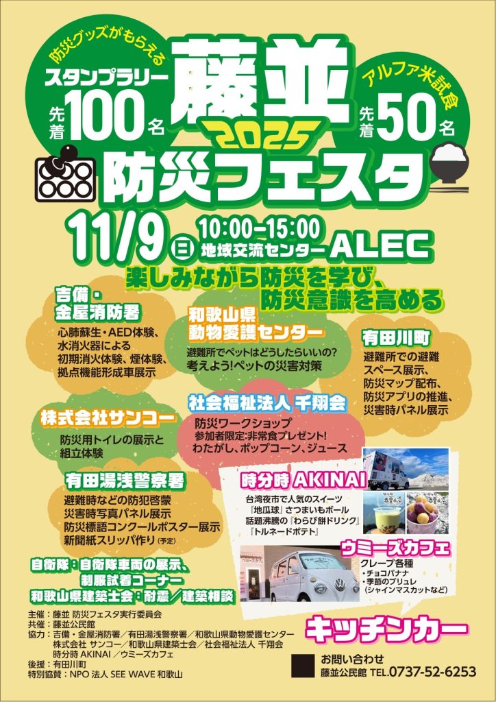 2025年11月9日、和歌山県有田川町の地域交流センターALECで開催される、「藤並防災フェスタ2025」に出店します。