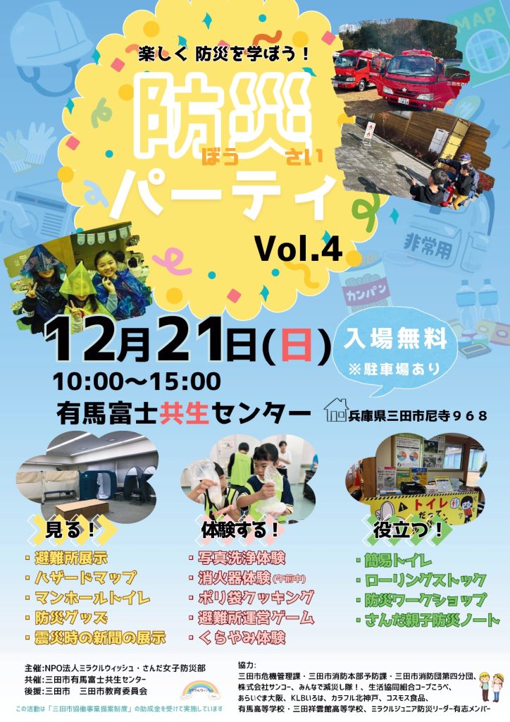 2025年12月21日、兵庫県三田市の有馬富士共生センターで開催される、「防災パーティ VOL4」に参加します。サンコーは、簡易トイレ各種を展示し、防災用トイレの重要性や必要な備蓄数をお伝えし、簡易トイレの組み立てや凝固剤を固める体験などを実施いたします。