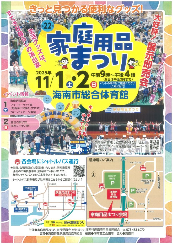 2025年11月1日・2日、和歌山県の海南市総合体育館で開催される「第22回家庭用品まつり」に出店します。